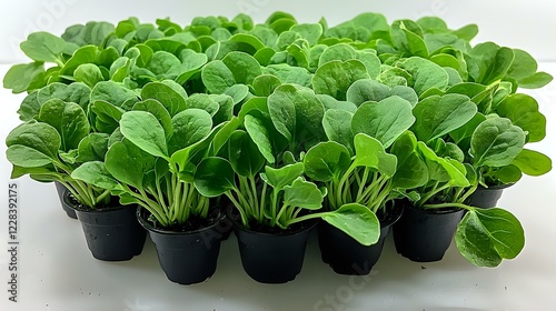 Fresh green petunia seedlings growing in small black plastic pots, showing healthy leaves and compact growth pattern suitable for garden planting and landscaping.
