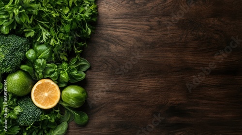 Fresh Green Produce Arrangement on Dark Wood, Healthy Eating Concept