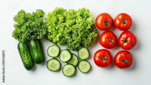 Fresh Green Salad, Cucumbers, and Ripe Tomatoes on White Background