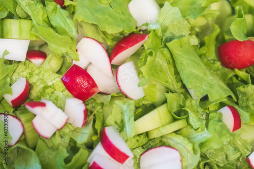 Fresh green salad with cucumbers and radishes.