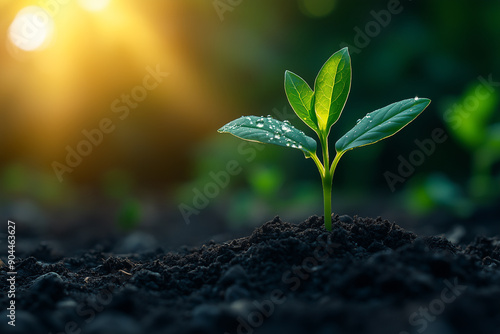 Fresh green seedling rising from rich earth under warm golden sunlight