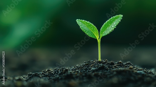 Fresh Green Seedling Surrounded by Dark Soil with Dew Drops, Symbolizing New Life and Growth in Nature