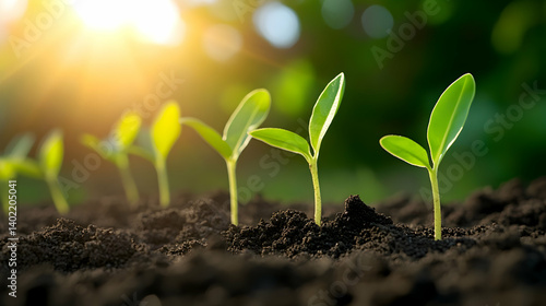 Fresh green seedlings emerging from rich soil, bathed in warm sunlight, representing new beginnings and growth in nature