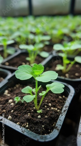 Fresh green seedlings growing in small pots in a greenhouse, perfect for mobile phone wallpaper