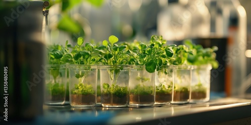 Fresh green seedlings in clear containers, vibrant plant growth in a greenhouse, ideal for gardening and eco-friendly themes.