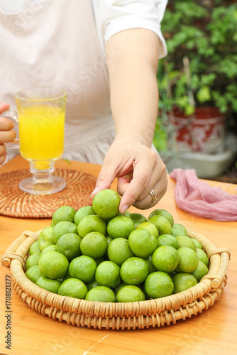 Fresh Green Sichuan Plums in Wicker Basket - Woman Selecting Healthy Fruit in Kitchen Setting