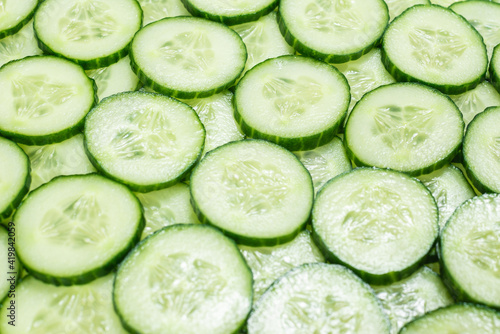 Fresh green slices of cucumber as background.