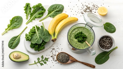 Fresh green smoothie ingredients including kale spinach bananas avocado and quinoa seeds arranged artistically on white background