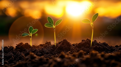 Fresh green sprouts emerging from rich soil at sunrise, symbolizing growth, renewal, and the beauty of nature.