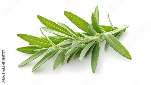 Fresh Green Tarragon Sprig with Elongated Leaves on White Background