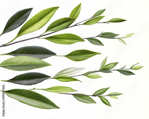 Fresh green tea leaves on branches, isolated on white background, perfect for tea packaging or healthy lifestyle content