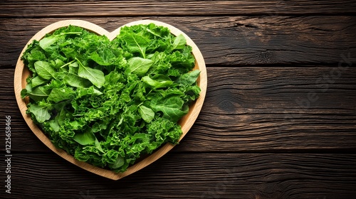 Fresh greens arranged in a heart-shaped wooden bowl on a rustic table