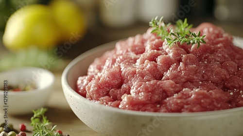 Fresh Ground Beef in Bowl, Herbs, Vegetables Background, Kitchen Scene