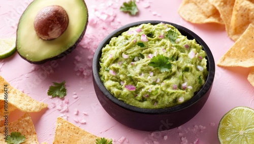 Fresh guacamole dip with chips, avocado, and lime on pink surface