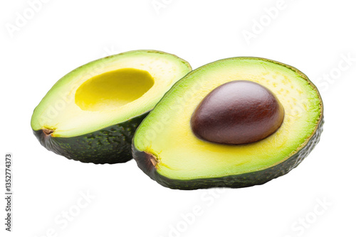 Fresh halved avocado with seed and vibrant green flesh, cut out