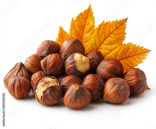 Fresh Hazelnuts with Bright Yellow Maple Leaf on White Background – Perfect Autumn-Themed Food and Nature Concept Image for Seasonal Designs and Promotions