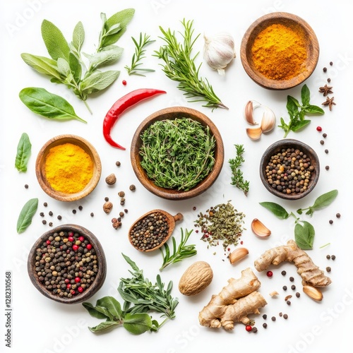 Fresh herbs and spices arrangement with ginger and garlic on white background
