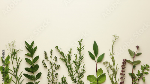 Fresh herbs arranged light background, showcasing various green shades and textures, perfect for culinary use or decoration