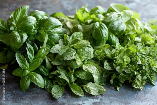Fresh Herbs Basil, Cilantro, and Mint Arranged Beautifully on a Rustic Surface. Generative AI
