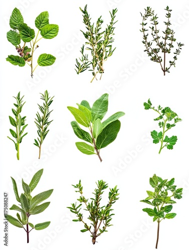 Fresh herbs collection rosemary, thyme, oregano, sage, parsley, bay leaf. Food cooking ingredient background.