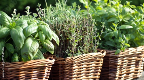 Fresh Herbs in Wicker Baskets in Lush Garden