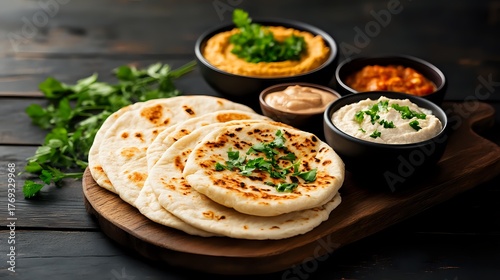 Fresh homemade flatbread served on wooden board with variety of dips, hummus, spicy sauce and herbs. Traditional middle eastern cuisine on rustic table.