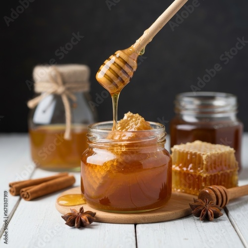Fresh Honeycomb Dipped in Jar with Dripping Honey Close Up
