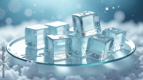 Fresh ice cubes stacked and melting on a reflective glass plate with water droplets