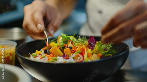 Fresh ingredients are being skillfully mixed in bowl, showcasing vibrant colors and textures. chef hands delicately combine fruits, vegetables, and herbs, creating visually appealing dish