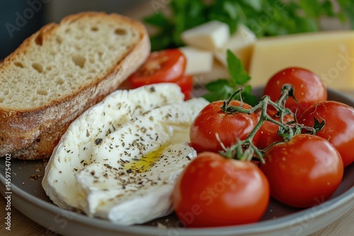 Fresh ingredients displayed on a plate with bread, tomatoes, cheese, and herbs for a delightful meal preparation