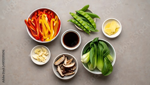 Fresh ingredients for asian cooking featuring vegetables and sauces ready for food preparation