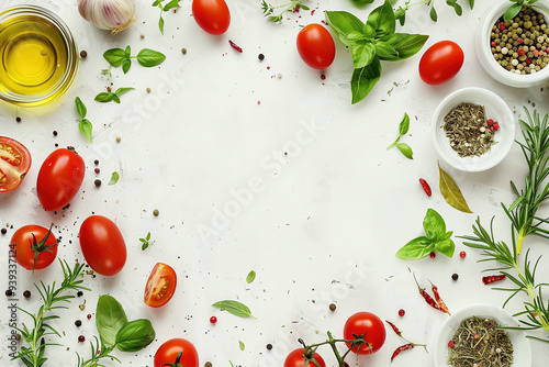 Fresh ingredients for cooking on a marble countertop, including tomatoes, garlic, basil, olive oil, and herbs