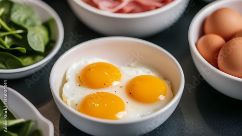 Fresh Ingredients for Cooking:Cracked Raw Eggs, Spinach, and Ham Displayed on Table