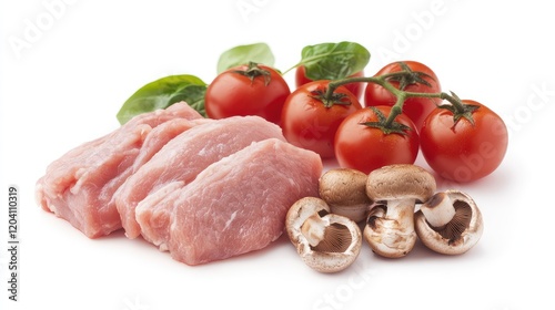 Fresh ingredients including raw pork meat, cherry tomatoes, spinach leaves, and mushrooms on a white background with Copy Space.
