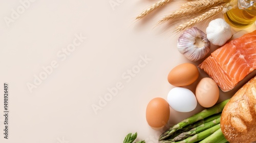 Fresh ingredients including salmon, eggs, garlic, and asparagus arranged on a neutral background