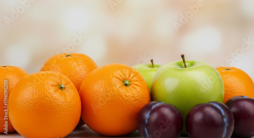 Fresh Juicy Oranges Green Apple Plums Fruit Still Life