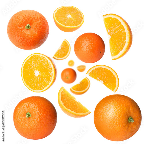 Fresh juicy oranges swirling in air against white background. Citrus fruit
