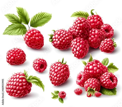 Fresh Juicy Raspberries with Green Leaves in a Realistic Watercolor Style on White Background