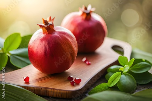 Fresh juicy whole or half pomegranate fruit, still life on a wooden background. Close-up photo.