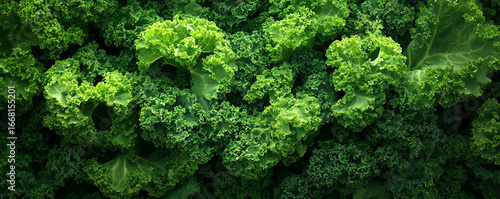 Fresh kale leaves overlapping each other, showcasing vibrant green hues and rich textures.