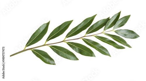 Fresh laurel leaves, vibrant green, stem with leaves arranged in a row, isolated on white background