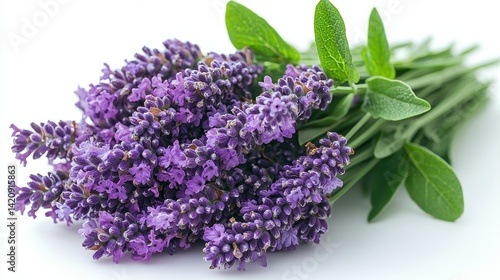 Fresh lavender bouquet with green leaves on a white background, ideal for aromatherapy