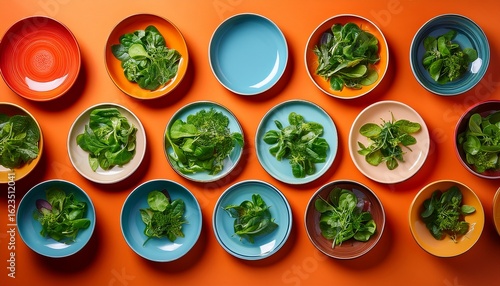 fresh leafy greens in colorful bowls on a vibrant orange background surrounded by empty plates creating a lively and healthy dining scene