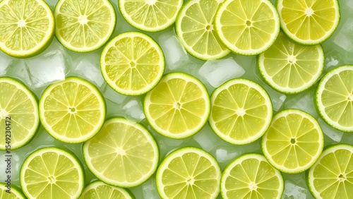 Fresh lemon slices arranged with clear ice cubes on a green surface. Perfect for themes of summer, tropical drinks, freshness, healthy lifestyle, and cooling citrus-inspired visuals.