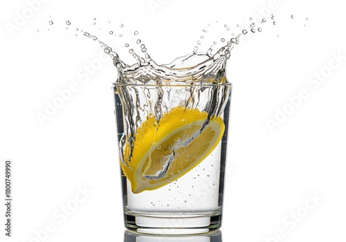 Fresh lemon wedge splashing dynamically into a clear glass of water creating a large splash.