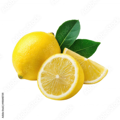Fresh lemon whole and slices fruit with leaf isolated background