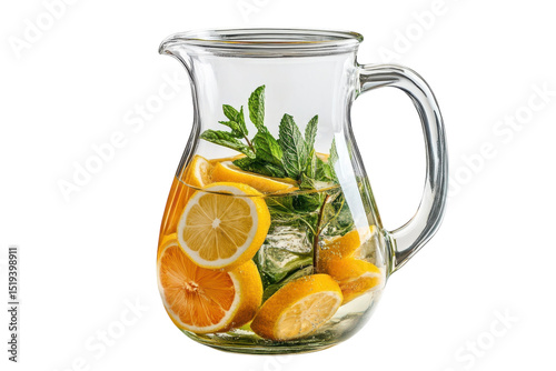 Fresh Lemonade Clear Pitcher of Citrus Fruit Orange Yellow Lemons and Fresh Mint Sprigs on transparent background