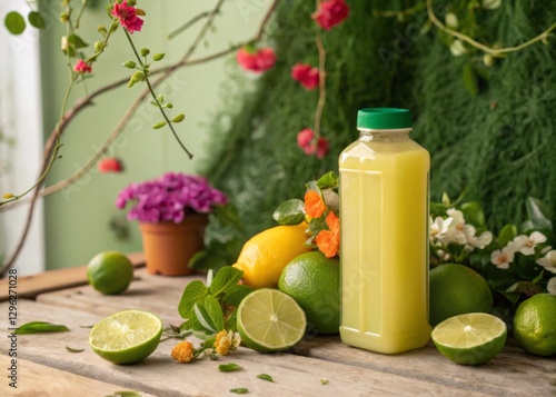 Fresh Lemon-Lime Juice in Plastic Bottle, surrounded by citrus fruits and flowers.