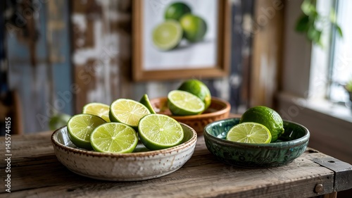 Fresh Limes in Rustic Bowls on a Wooden Table