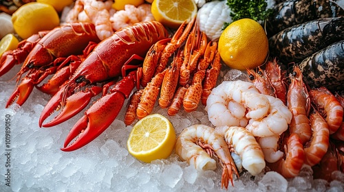 Fresh Lobster, Shrimp, and Lemons on Ice